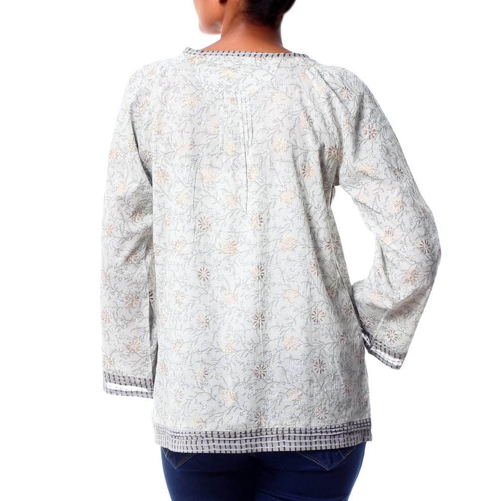 Made from cotton in the palest shade of celadon green, this blouse from India’s Vijay Singh epitomizes feminine grace. The soft, lightweight fabric boasts a block print of vines in grey and white accentuated by golden blossoms.