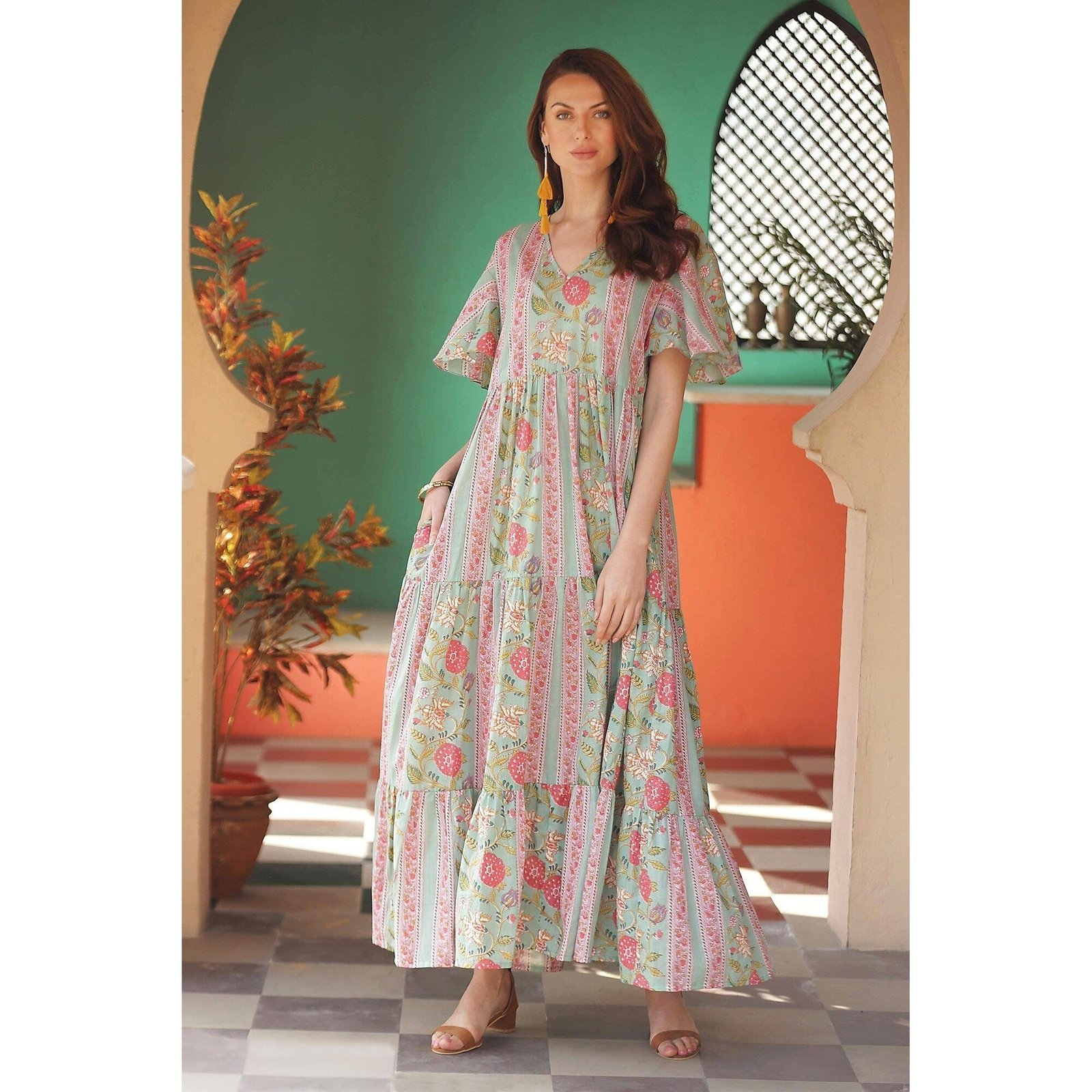 Pretty enough for a date at the botanical garden, but comfortable enough to lounge in, this flowing maxi dress is created by Aftab in India. The artisan chooses a pink floral print on a background of celadon green to create the feminine cotton dress, which has flutter sleeves, an empire waistline and three tiers between waistline and hem.